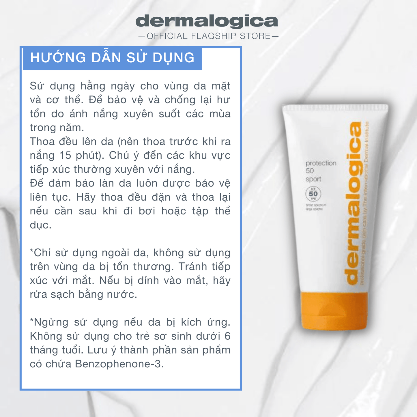 Chỉ sử dụng ngoài da. Không sử dụng trên da bị tổn thương hoặc bị hỏng. Tránh tiếp xúc với mắt. Nếu xảy ra tiếp xúc, hãy rửa sạch bằng nước. Bôi trước khi ra nắng và bôi lại thường xuyên. Ngừng sử dụng nếu kích ứng da. Không sử dụng cho trẻ sơ sinh dưới 6 tháng. Chứa Benzophenone-3.